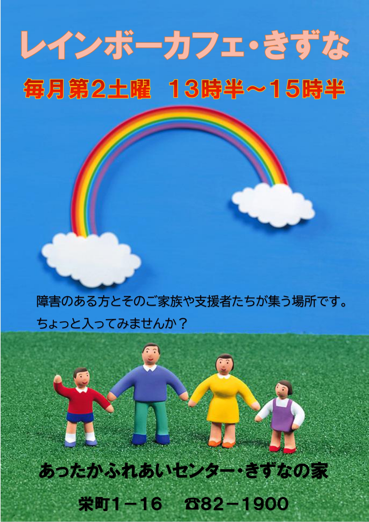 あったかふれあいセンター・きずなの家では、毎月第2土曜日の午後に、障害のある方とご家族、支援者が集う場所として「レインボーカフェ・きずな」を開催していますので、お気軽にお越しください。