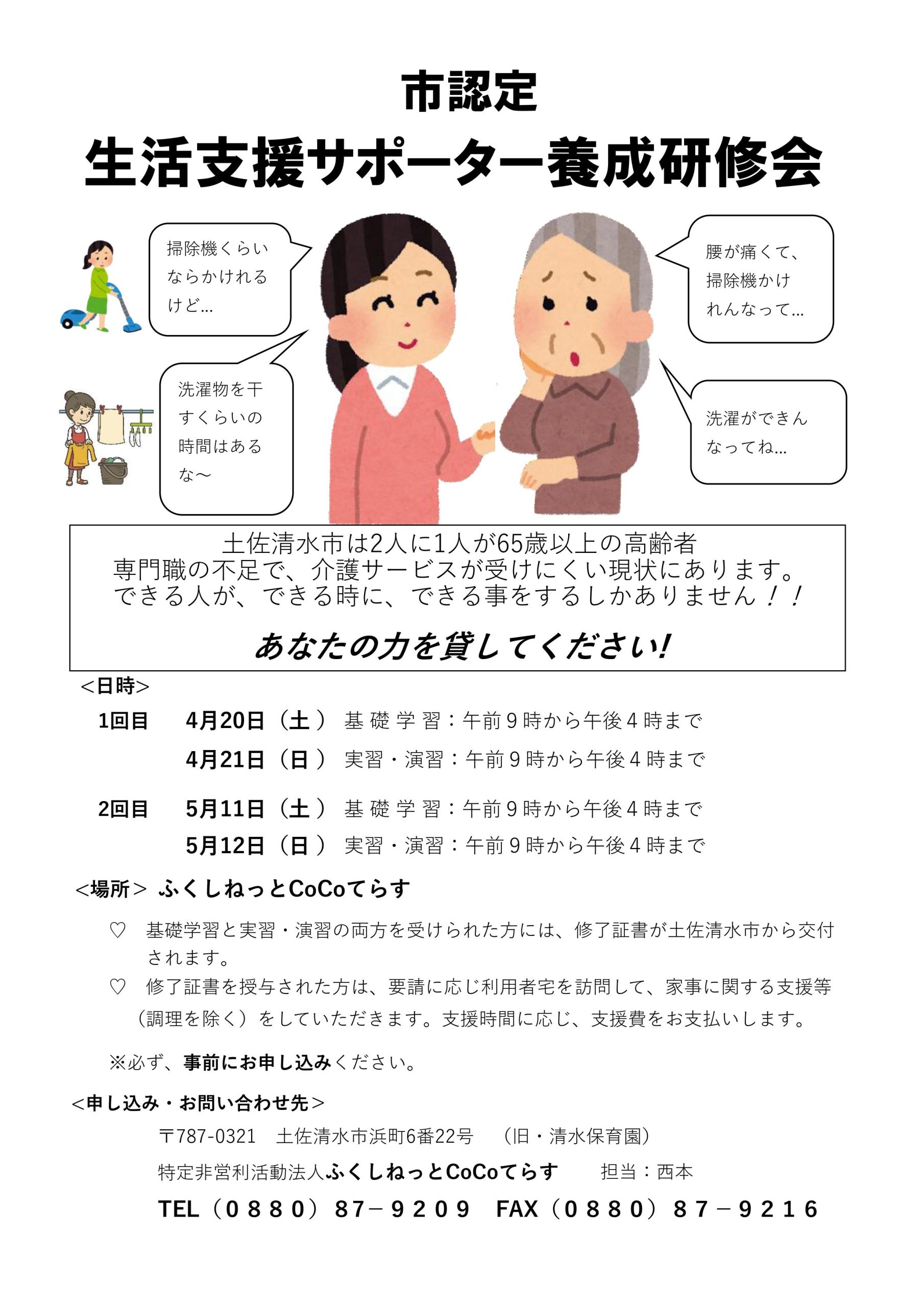 ふくしねっとCoCoてらすで、生活支援サポーター養成研修会を開催します。