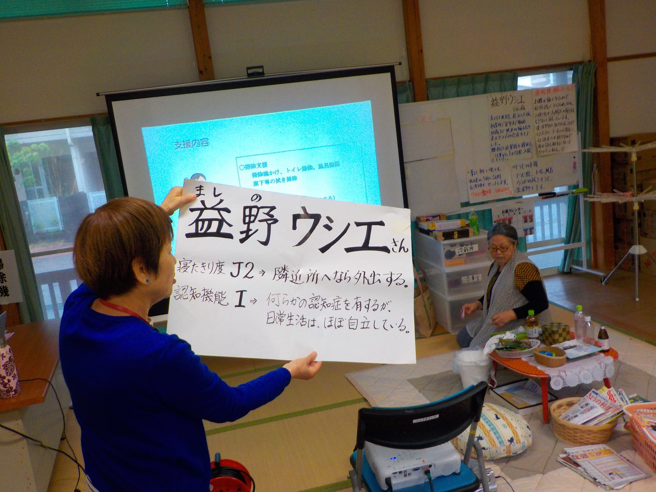 初日は土佐清水市役所健康推進課の入野氏、渭南病院認知症看護認定看護師の仮谷沙智氏、亀の子ヘルパーステーションの吉名絵美氏に講師をしていただき、生活支援サポーターとして必要な知識について伝えていただきました。