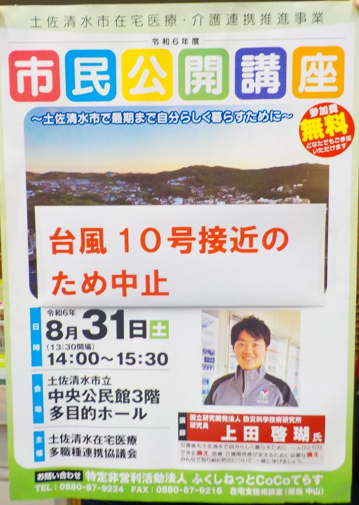 8月31日(土)に土佐清水在宅医療多職種連携協議会の主催で開催を予定しておりました「市民公開講座」は、大型の台風10号の接近の予報を受けまして、市民のみなさまの安全を考慮いたしました結果、中止とさせていただきます。