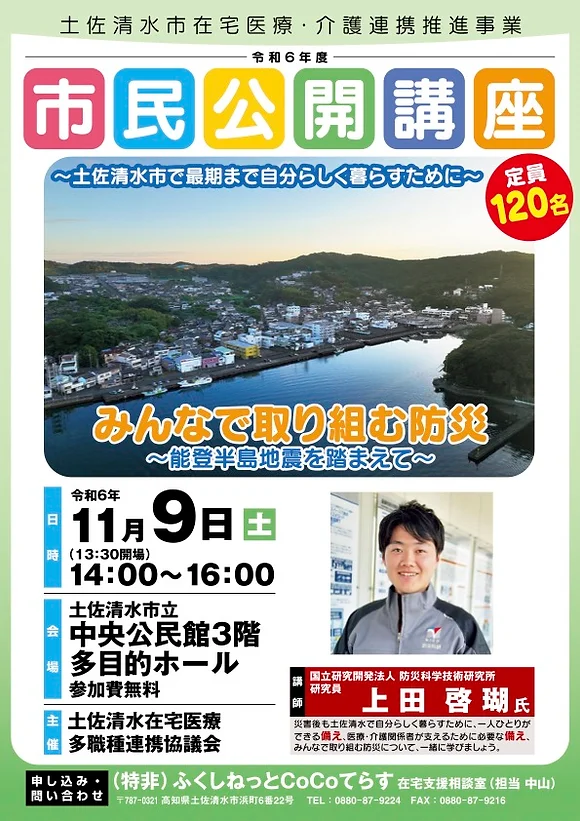 台風10号の影響で中止となった土佐清水在宅医療多職種連携協議会主催の「市民公開講座」は、以下の日程に変更となりました。 当日申し込みも可能ですが、定員120名とさせていただいておりますので、お早めに申し込み・お問合せをお願いします。