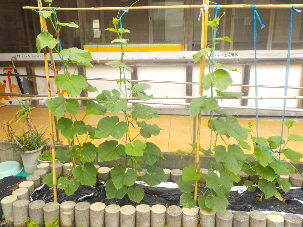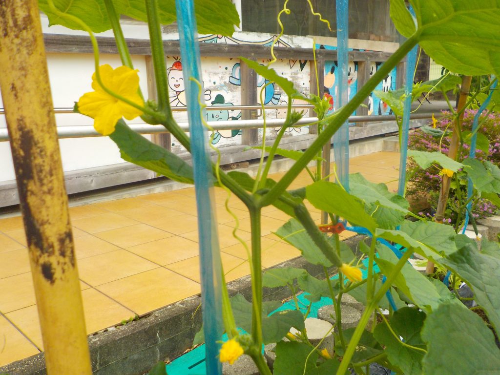 会員さんにいただいたきゅうりがすくすく成長しています。
