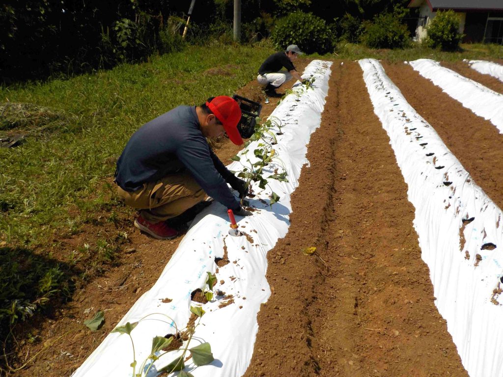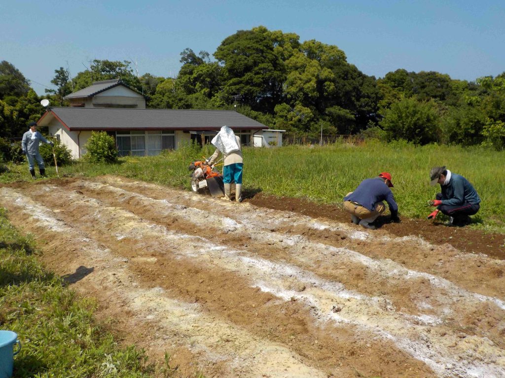 草刈り、根っこ取り、石灰まき、畝たて、マルチ張り、植え付け、水まき…