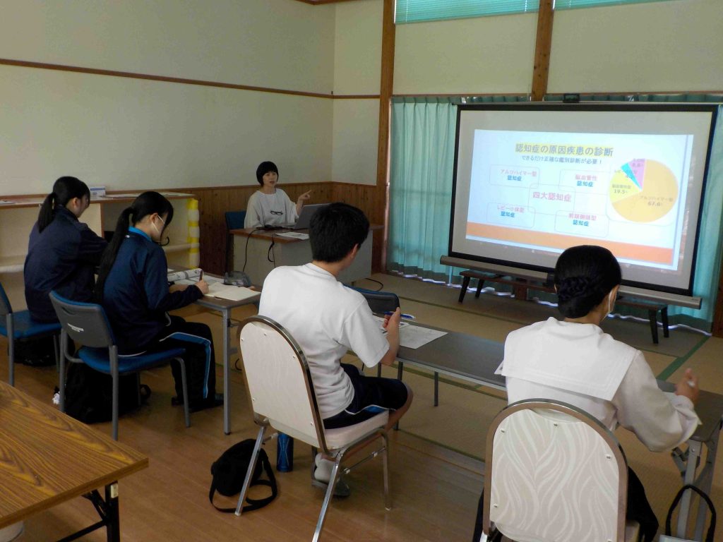 グループホーム百日紅の家統括管理者の西村さんから、認知症の方々との暮らしや関わる時に大切にしていることなどをお話していただきました。高校生からは「施設のイメージが変わった」「一人ひとりを尊重するケアが大切と思った」「やりがいが生きる希望につながるというのがなるほどと思った」などの感想が聞かれました。